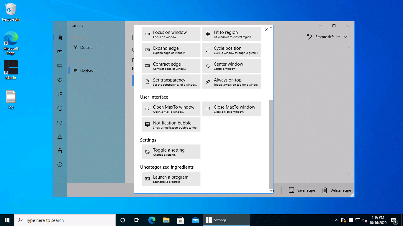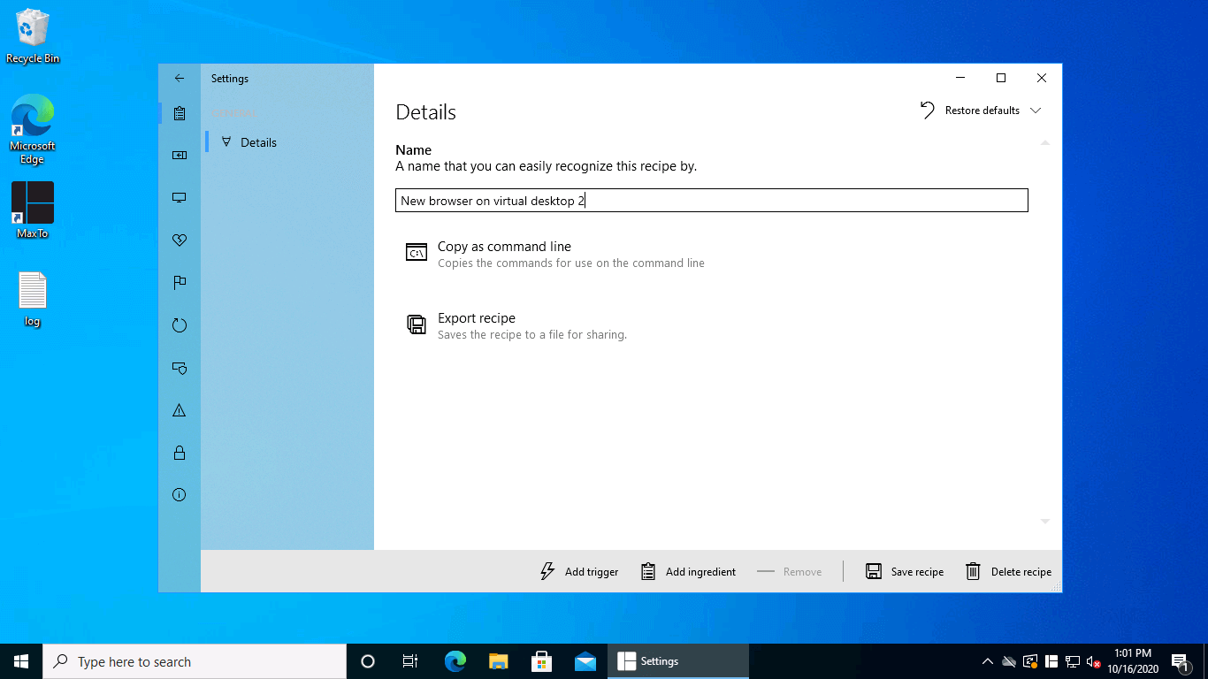 Click "Add ingredient"We now want to add the ingredient that will move the window to a specific region in a virtual desktop, so select the Move window command.