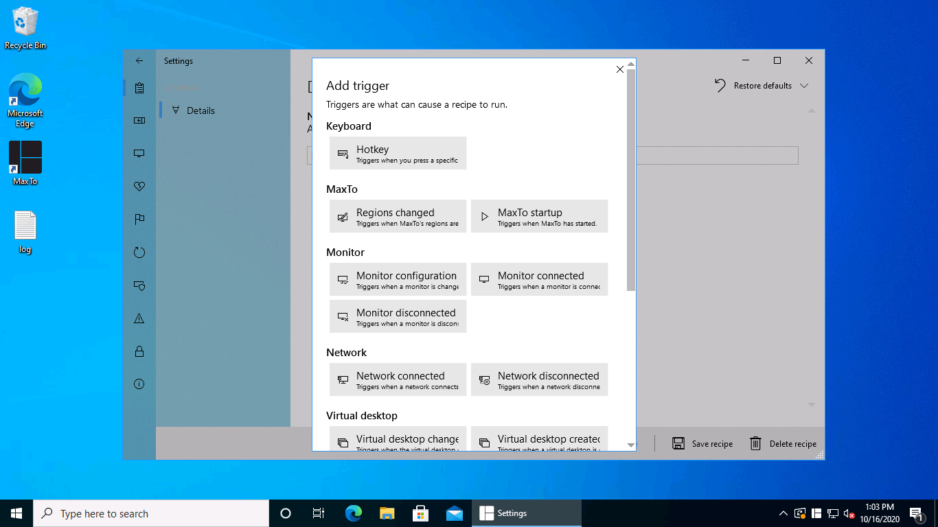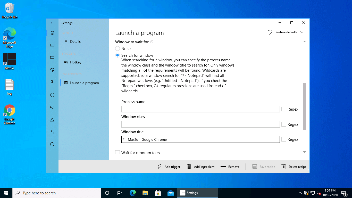 It's hereYou can use the same arguments for finding the window as you did earlier, and then set the numbered virtual desktop to 2, and the region to top right. Once you are done, hit Save changes, and the recipe will be available to run immediately.